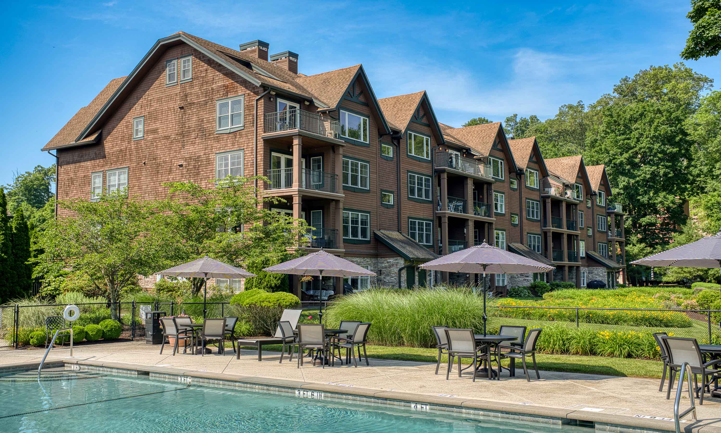 The four-story buildings are fashioned in the grand style of Adirondack lodges and sit on meticulously landscaped grounds.